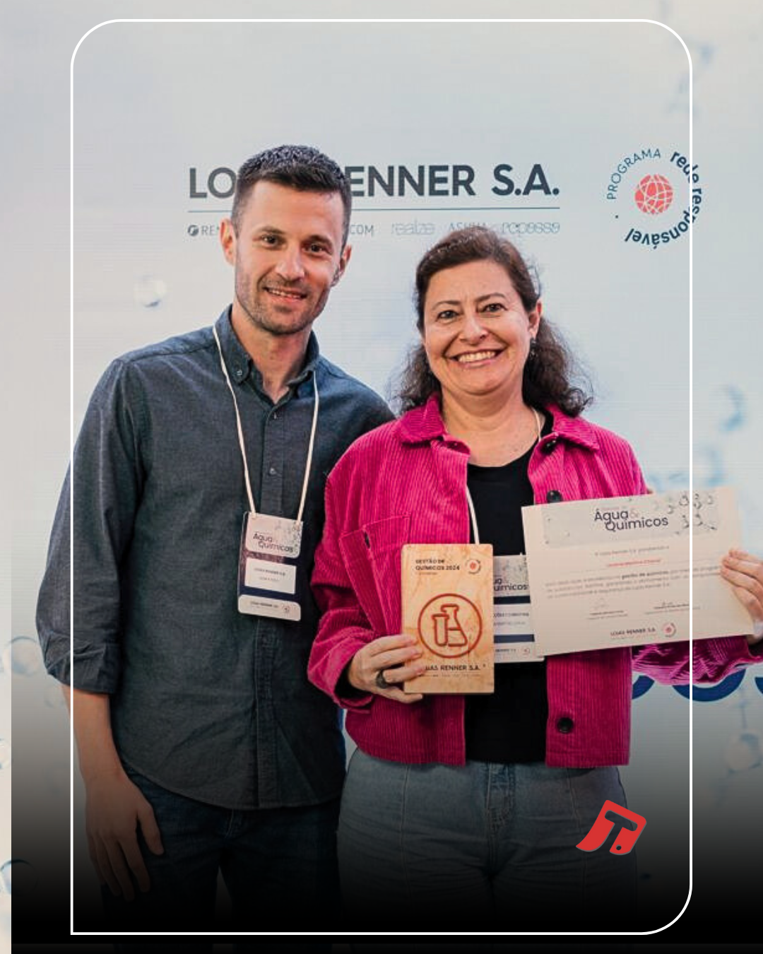 Prêmio Gestão de Químicos, Lojas Renner, entregue pelas mãos do gerente de gestão de fornecedores, Renan Pedot, à nossa gestora de qualidade, Liciana Chaud. Antes disso, nossos produtos foram testados e declarados livres de substâncias químicas nocivas e, portanto, banidas pela marca. E isso só foi possível porque o trabalho acontece em cadeia, com nossos fornecedores de matéria-prima e seus parceiros de beneficiamento também comprometidos com o padrão de qualidade e de segurança da Renner.